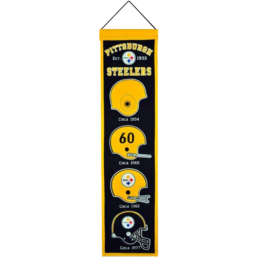 Every team has its own look, its own visual identity, and that often evolves over the years. Pay tribute to your favorite squad's unique logo with this Pittsburgh Steelers Heritage Banner from Winning Streakª. It boasts a wool construction, includes a hanging cord, and depicts the many versions of the club's emblem.