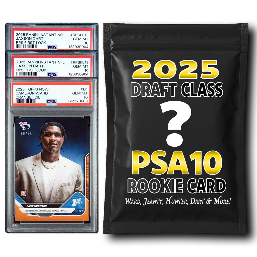 You're guaranteed to pull ONE of the following 2025 PSA 10 NFL Rookie Cards! Featuring: Jaxson Dart, Cam Ward, Travis Hunter, Ashton Jeanty, Cam Skattebo, Quinshon Judkins, TreVeyon Henderson, Shedeur Sanders, Abdul Carter, Emeka Egbuka, Tyler Warren, Tetairoa McMillan & More!