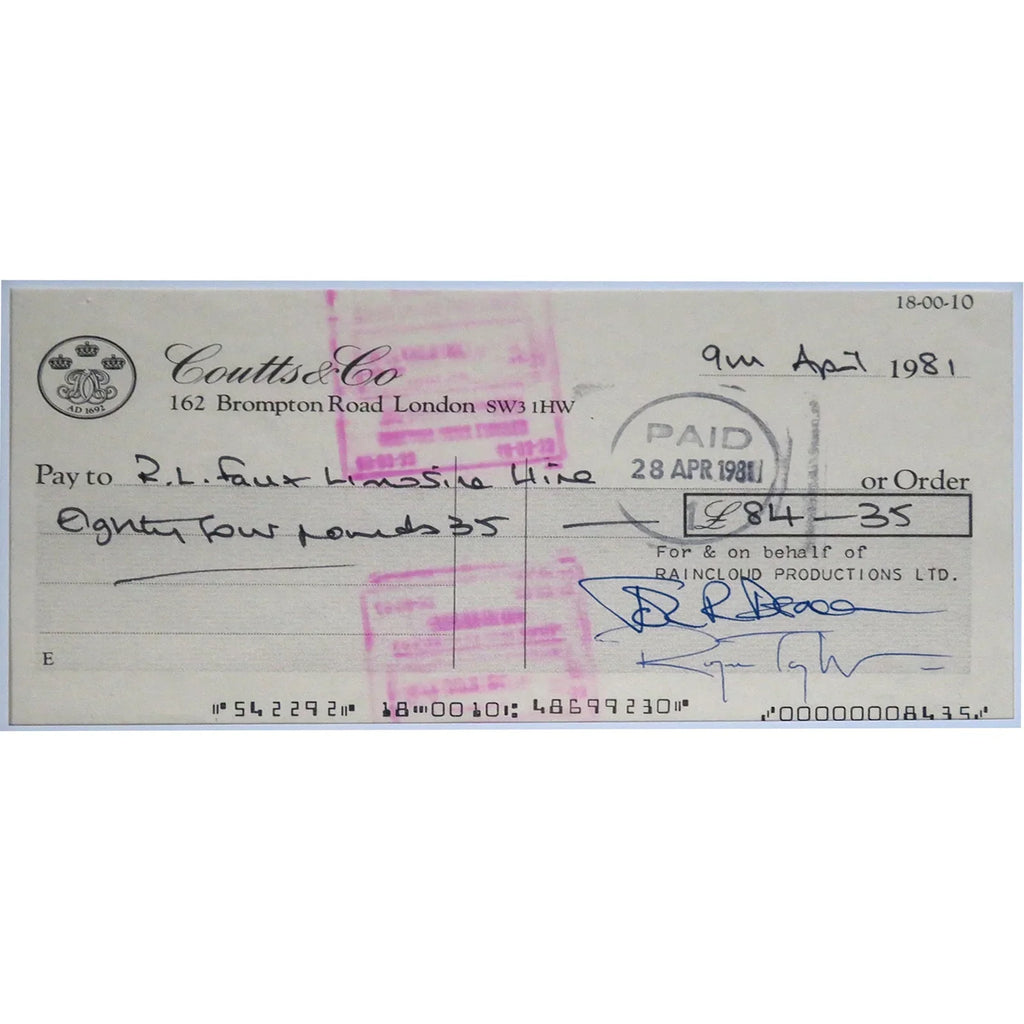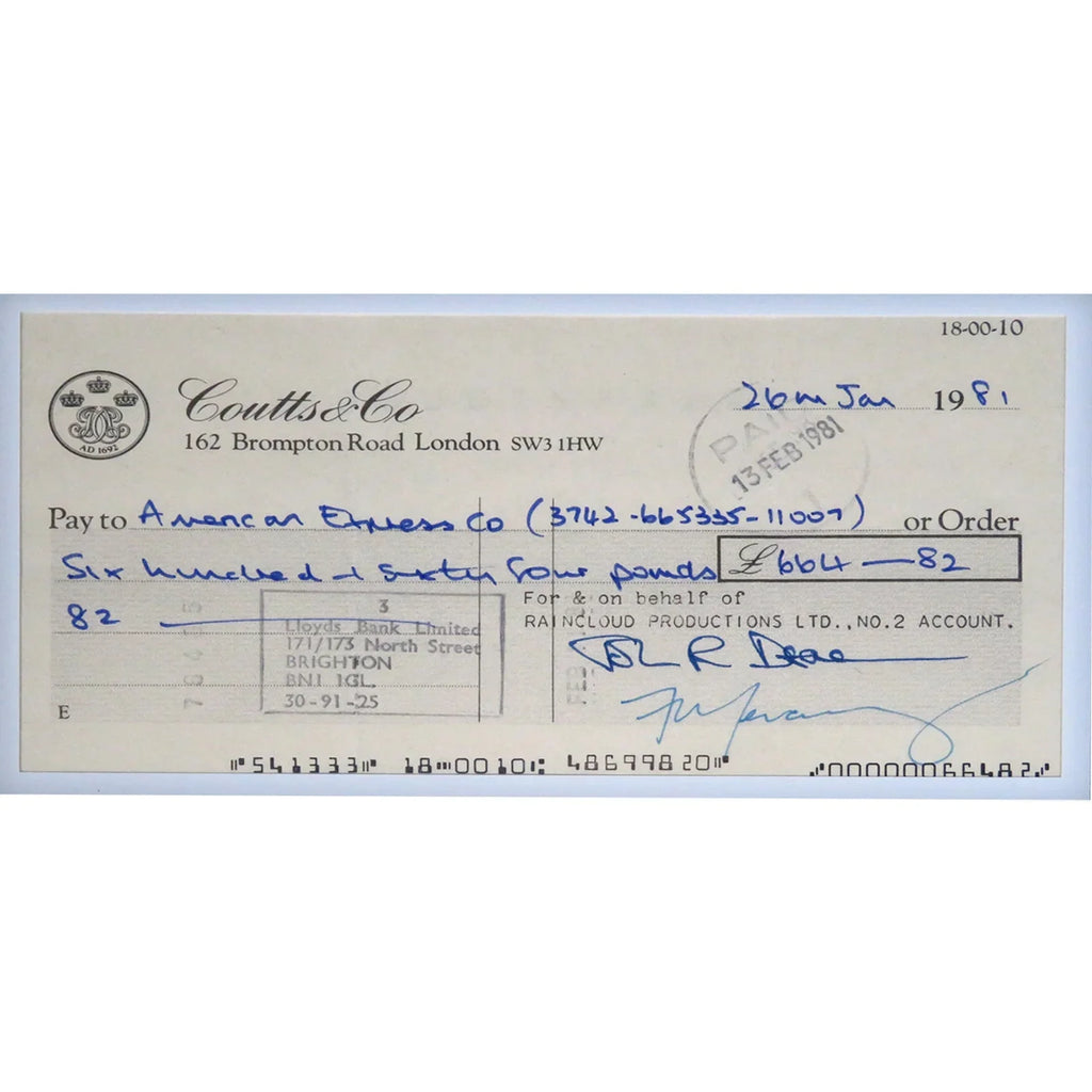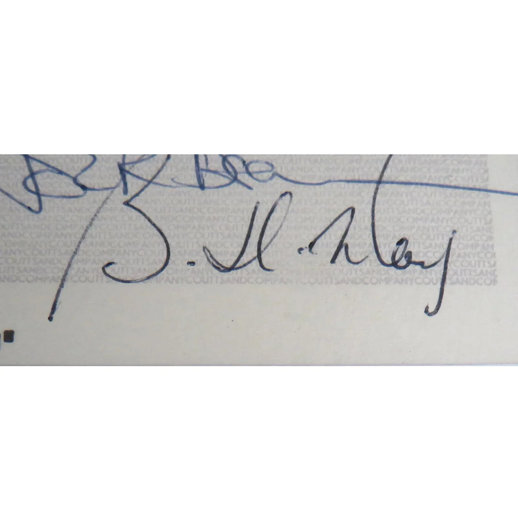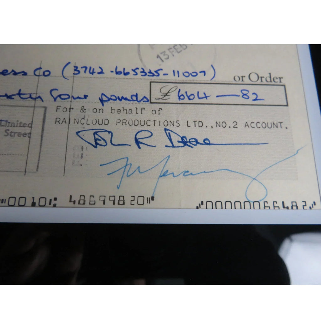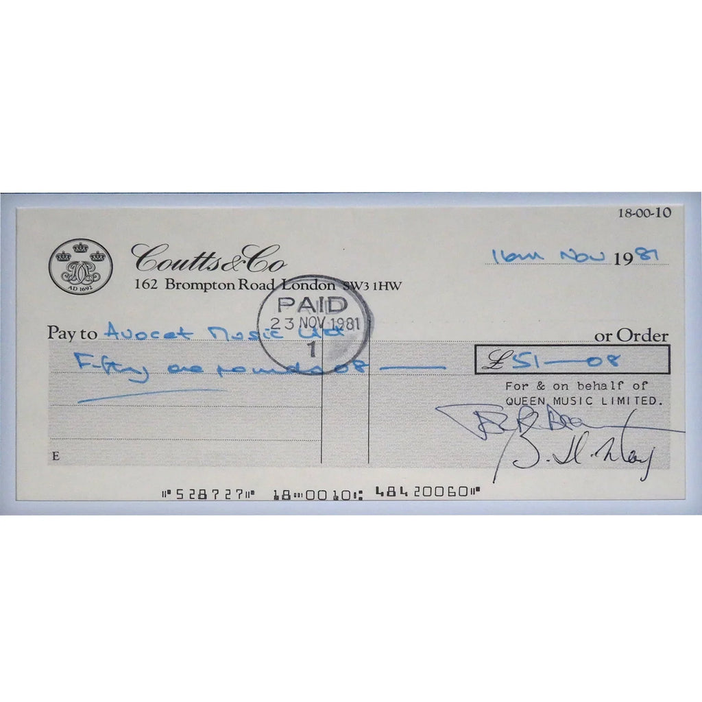Immerse yourself in the legendary rock band Queen with this autographed checks music display. Featuring the band's iconic signatures, this framed piece, certified by JSA and BAS, is a must-have for any fan or collector. Bring the energy and passion of Queen into your home or office!