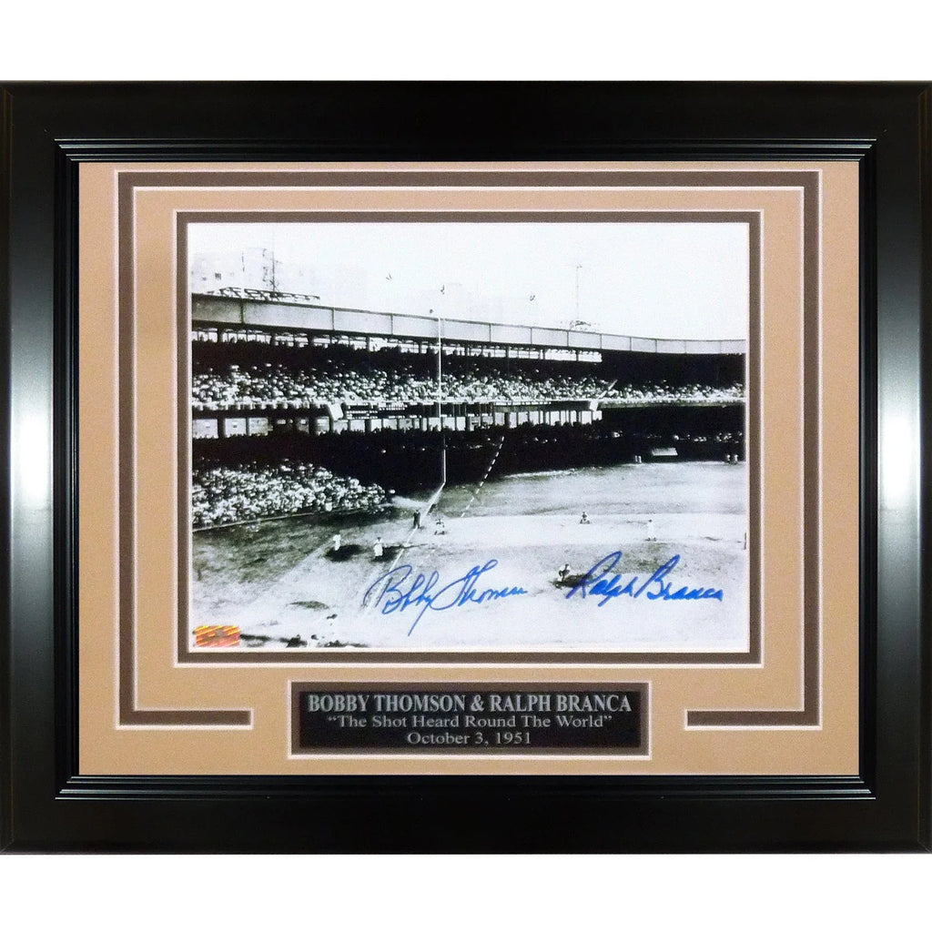 This unique and highly collectible 8x10 photo features the dual autographs of legendary baseball players Ralph Branca and Bobby Thomson. The iconic image of their "Shot Heard 'Round the World" home run is beautifully framed and ready for display. A must-have for any die-hard baseball fan. Each signature is witnessed by a member of our staff or comes out of a private signing.