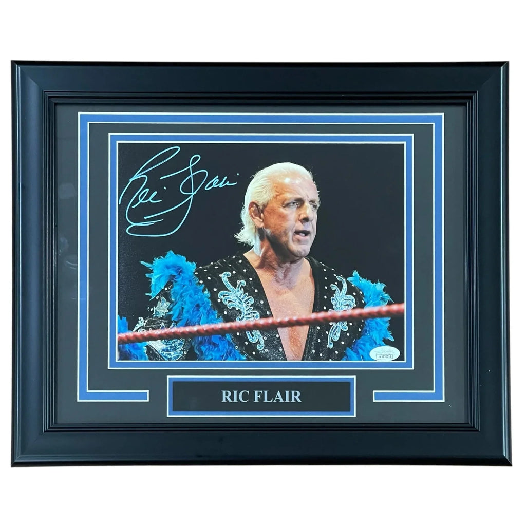 Enhance your collection with this stunning Ric Flair autographed wrestling photo. The blue robe and deluxe frame add a touch of elegance, while the JSA certification guarantees authenticity. A must-have for any wrestling fan, this 8x10 photo captures a legendary moment in the sport. Let Ric Flair's signature bring excitement to your display!