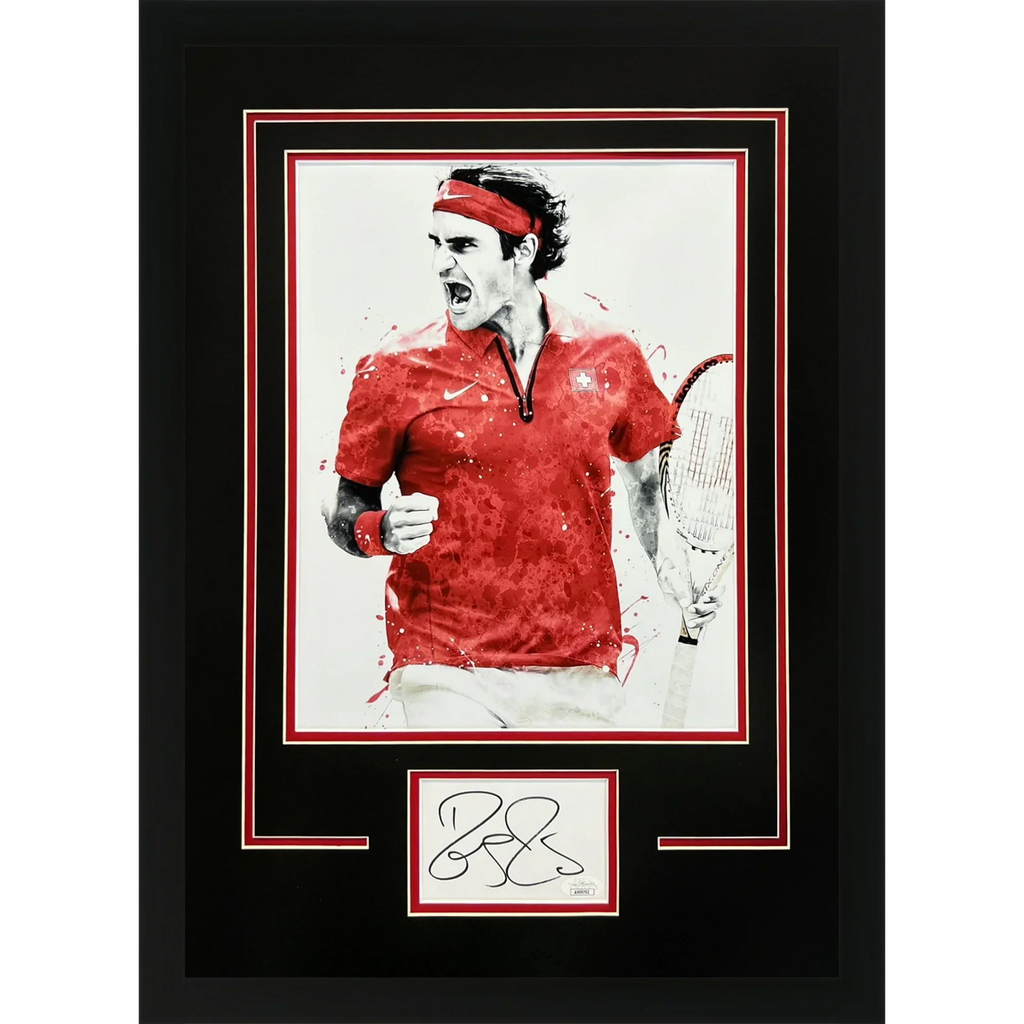 Elevate your fan status with this stunning Roger Federer autographed tennis piece. The deluxe frame enhances the 11x14 splash art of the legendary athlete. This unique item is not just for show but also comes with a certificate of authenticity from JSA and Palm Beach Autographs. A must-have for any true fan! A tamper-evident hologram will be affixed to the item. Each signature is witnessed by a member of our staff or comes out of a private signing.