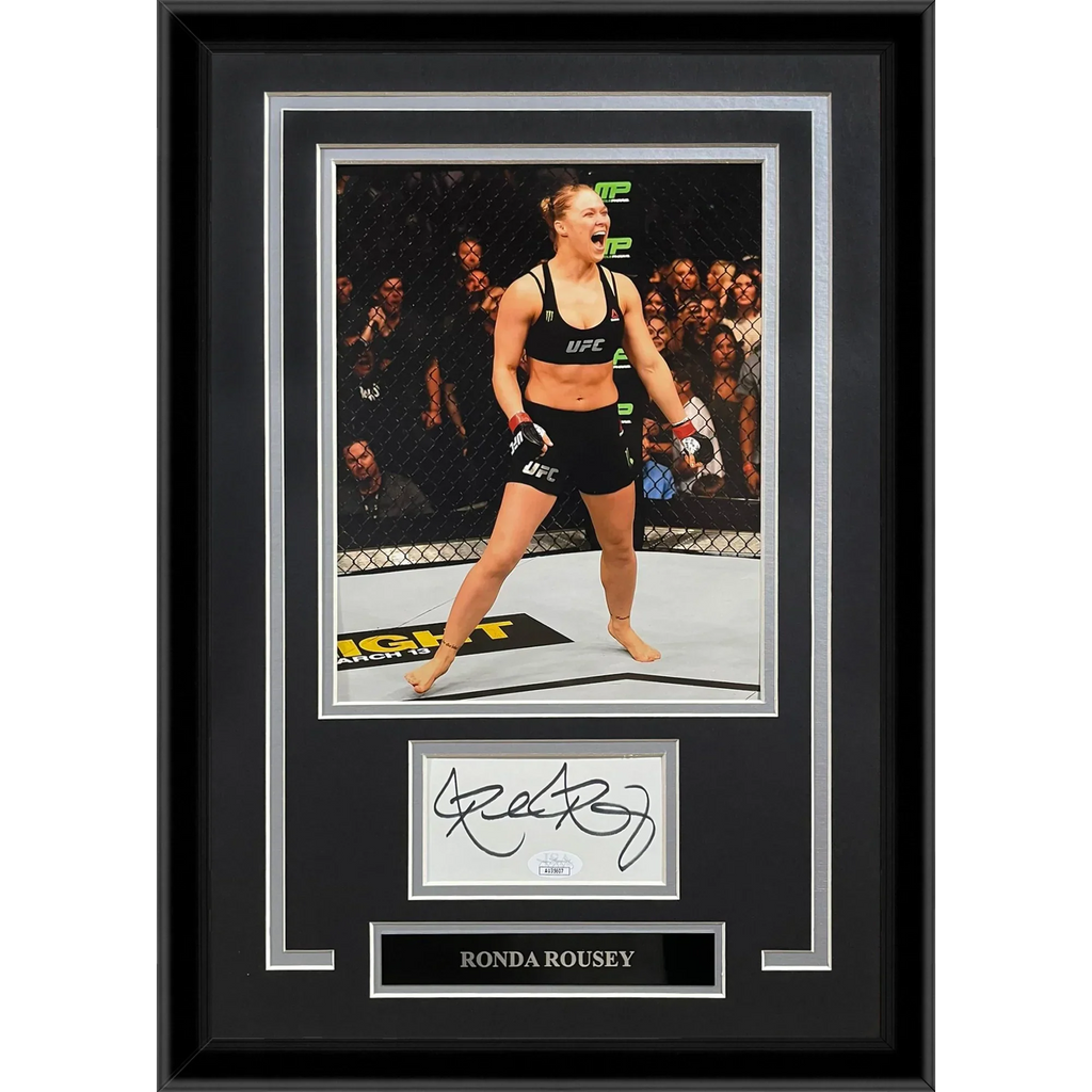 Experience the thrill of owning a piece of history with this Ronda Rousey autographed UFC 8x10 photo. The "Signature Series" frame adds an extra touch of elegance to this collector's item. Certified by JSA, this valuable piece is a must-have for any true fan of the fighter.