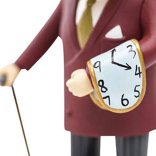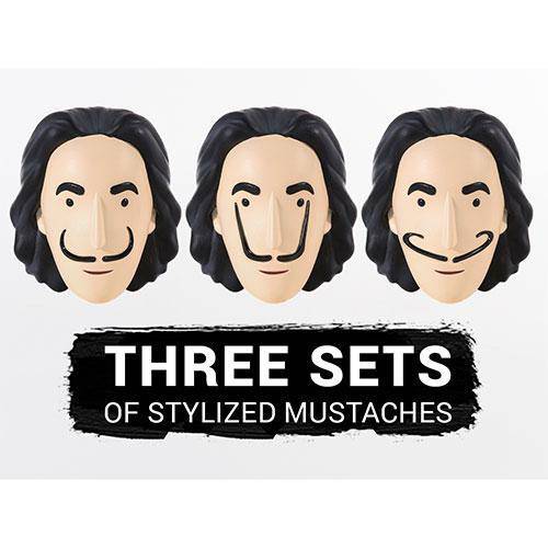 The Salvador Dali action figure comes with: Wacky adjustable mustaches. Deluxe mustaches made of stainless steel. His signature melting clock. 5 masterpieces to display on a miniature easel. Transparent base. The Gala-Salvador Dalí Foundation endorses this product. The action figure is 5 inches tall and made of pvc. warning: choking hazard. Small parts. This is not a toy. it is not designed nor intended for children under the age of 12.