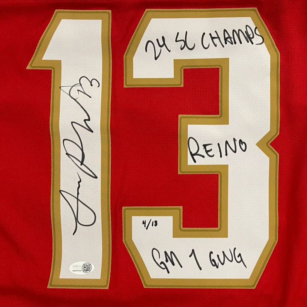 This is a limited edition piece of only 13 signed. Lace-up like a pro with this autographed Florida Panthers jersey from All-Star Sam Reinhart. Featuring his signature, three personalized inscriptions, and a JSA certificate of authenticity, this jersey is a must-have for any fan. Show off your team pride with this one-of-a-kind collectible straight from the ice!