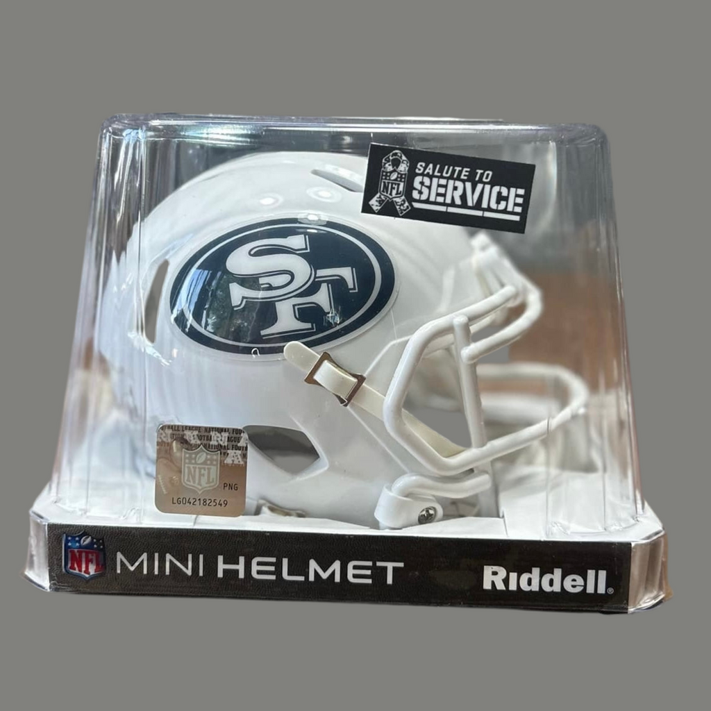 San Francisco 49ers Mini Speed Football Helmet. The ultimate NFL mini speed football helmet collectible, perfect NFL mini speed football helmets for autographs and collectors. Mini Speed Football Helmet with great graphics. Official NFL Mini Speed Football Helmet with official NFL team decal. ABS plastic Mini Speed Football Helmet shells with plastic facemask. Realistic interior foam padding, vinyl-leather chin strap. This is an affordable NFL football helmet for the true fan. Size: 1/2 scale versions of NFL football helmets. Size: 6"(L), 4½"(W), 5"(H) - (NOT FOR WEARING).