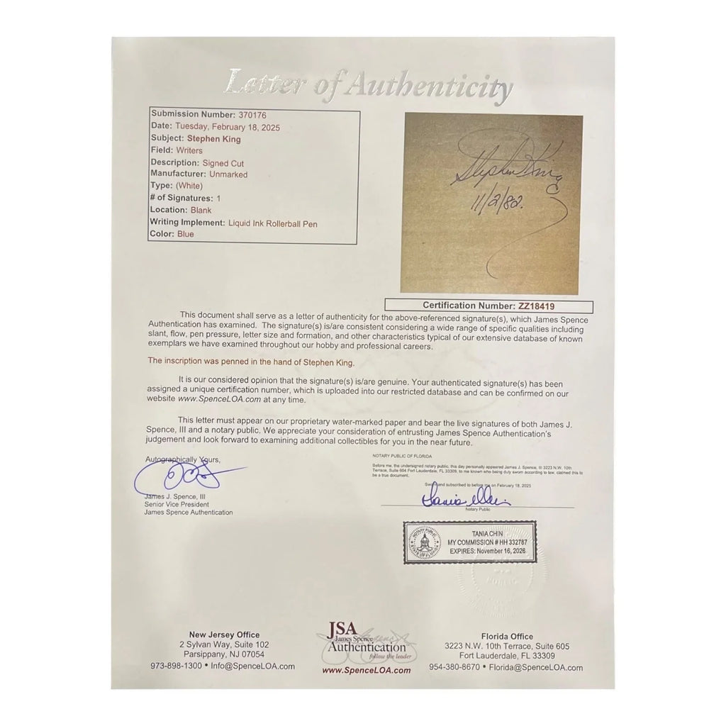 Own a piece of literary history with this authentic Stephen King autographed copy of "Fire-Starter." This book comes with a Letter of Authentication from JSA, guaranteeing the signature's legitimacy. Perfect for collectors and fans of the horror master, this rare, signed edition will be the centerpiece of any Stephen King collection. Don't miss this opportunity to own a personally signed work from one of the world's most celebrated authors.