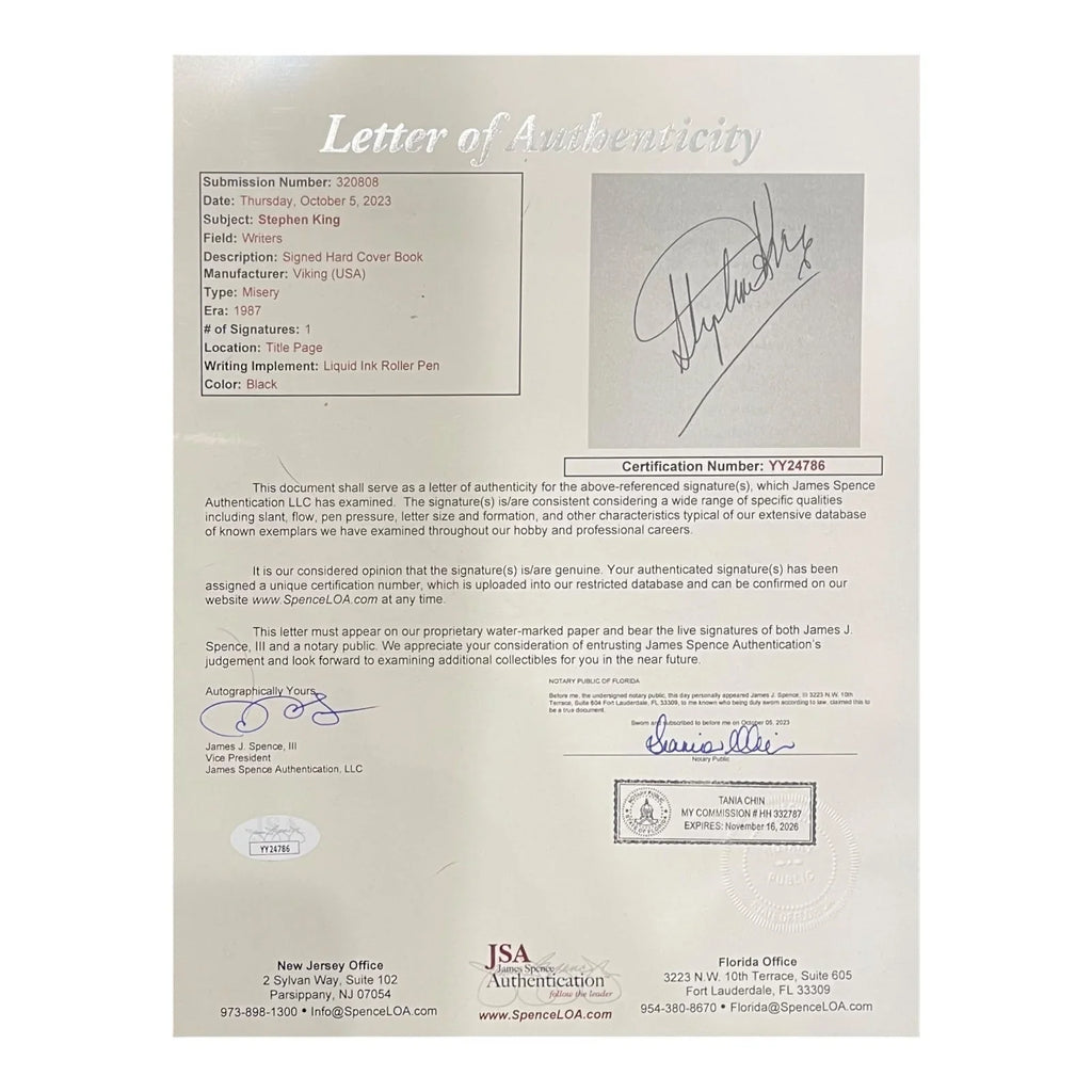 Own a piece of literary history with this Stephen King autographed copy of "Misery." This collector's item features the genuine signature of one of the world's most renowned horror authors, authenticated with a JSA Letter of Authentication. Perfect for serious collectors and King fans alike, this rare, signed edition will be the centerpiece of any book collection.