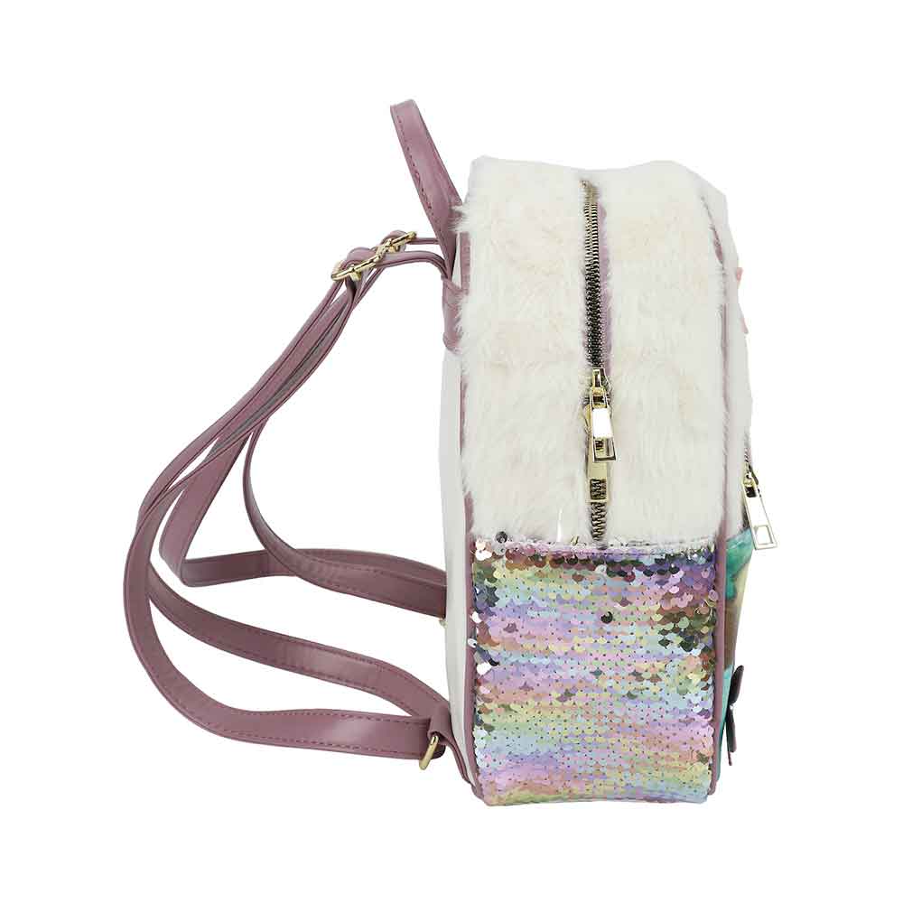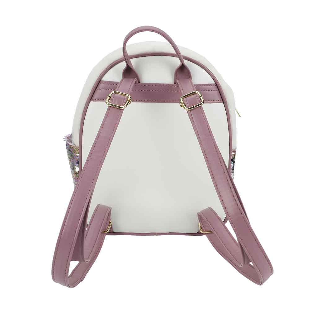 Carry your favorite mischievous duo wherever you go with this Stitch and Angel plush mini backpack! Officially licensed by Disney, this backpack features a zipper closure and adjustable shoulder straps for comfort. With an interior slide pocket and stylish materials like synthetic leather, sequins, and faux fur, this backpack is not only adorable but also functional. Measures 10.5H x 8.5W x 4D in. Care instructions: Wipe clean with a damp cloth.
