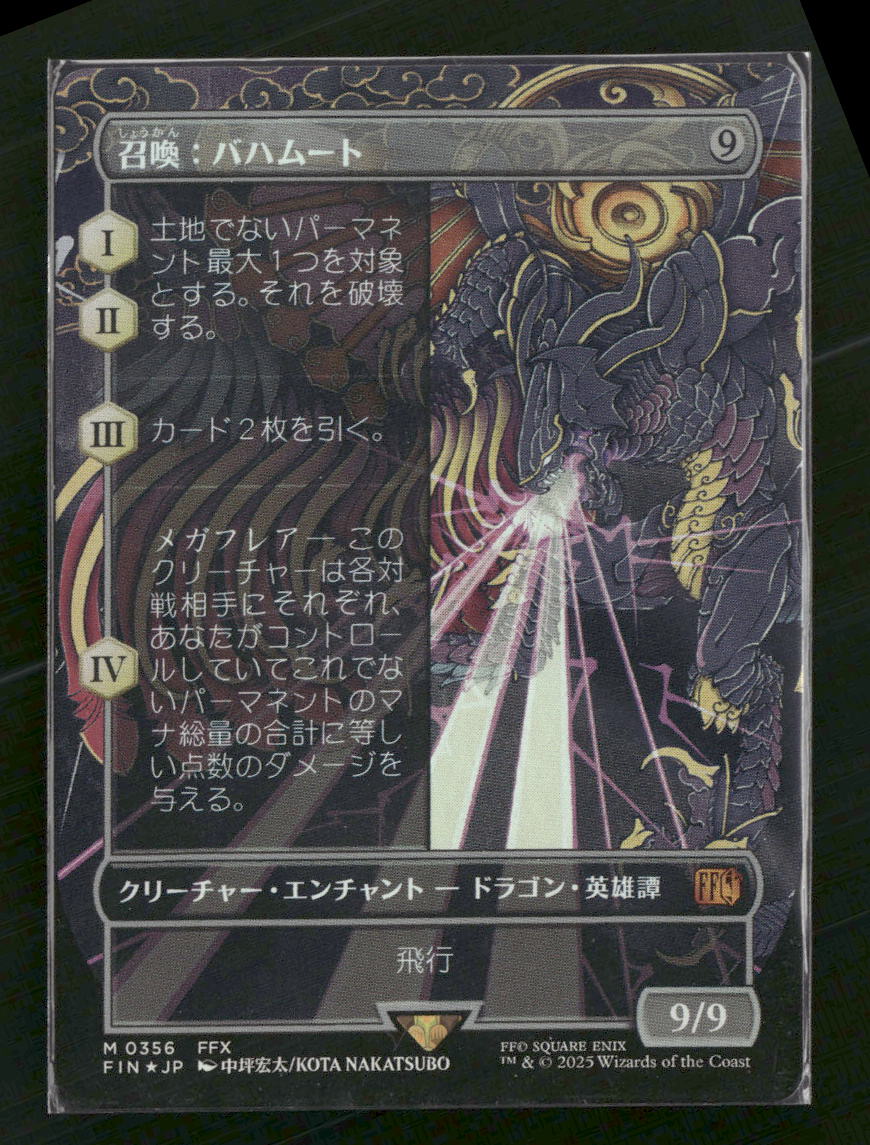 Card Number: 356 Category: Collectible Trading Cards Condition: Near mint or better Player/Character: Summon: Bahamut (Borderless) Set: FINAL FANTASY Type: Collectible Card Game Year: 2025 Game: MAGIC_THE_GATHERING Rarity: Mythic