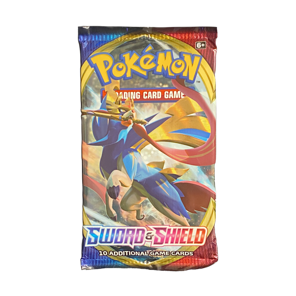 A sealed booster pack from the Pokemon TCG expansion Sword and Shield. Contains 10 cards.