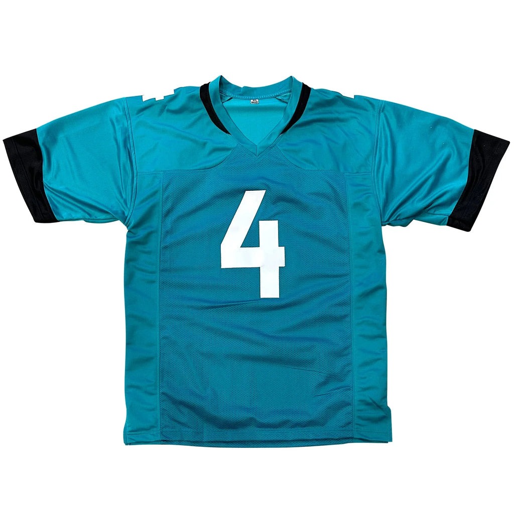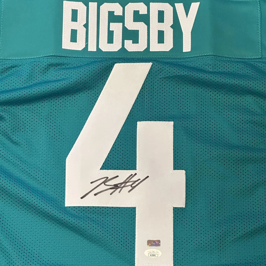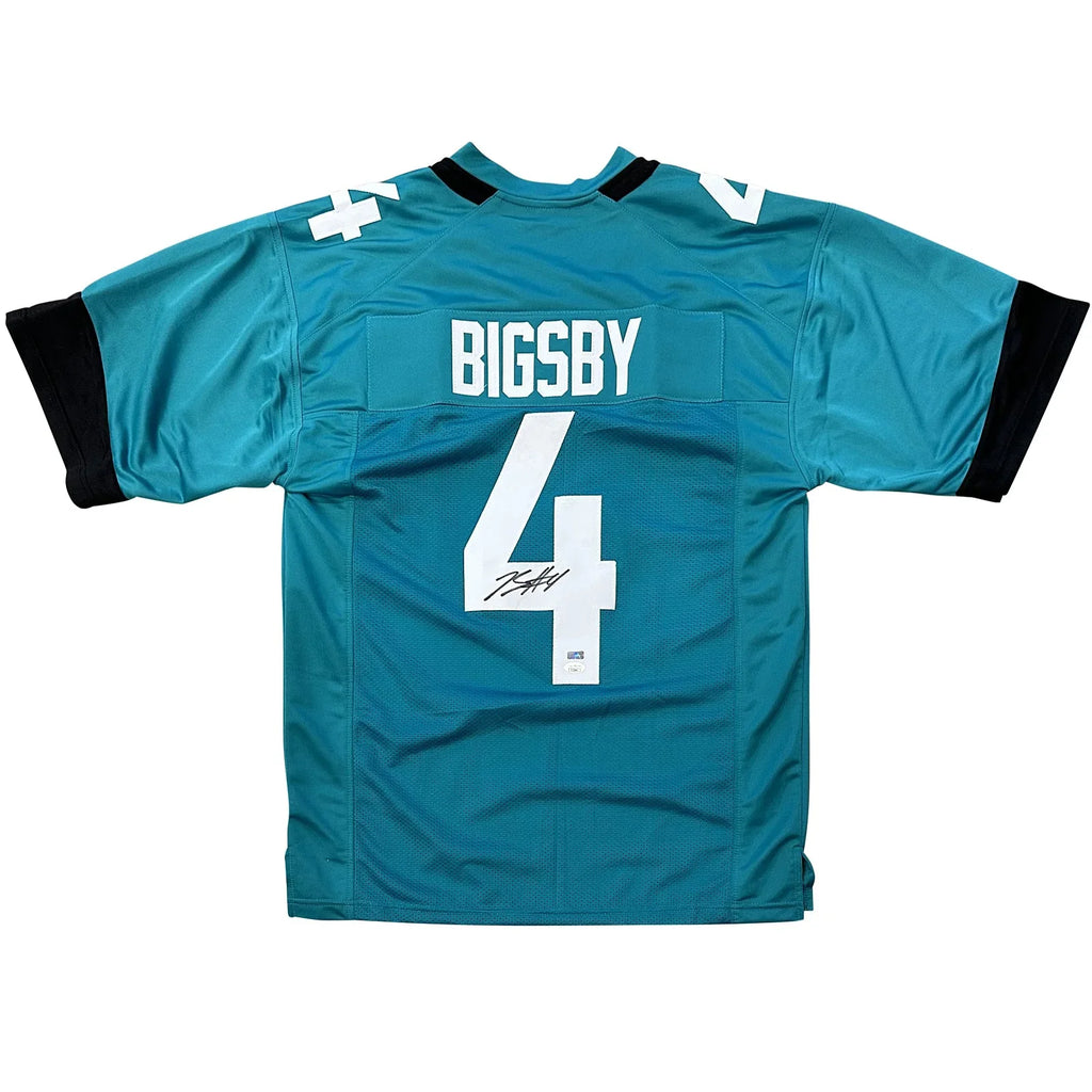 Own a piece of Jacksonville Jaguars history with our Tank Bigsby Autographed Custom Jersey. Certified by JSA, this teal jersey bears Bigsby's signature and player number 4. Display it proudly and show your support for the Jaguars' star running back!