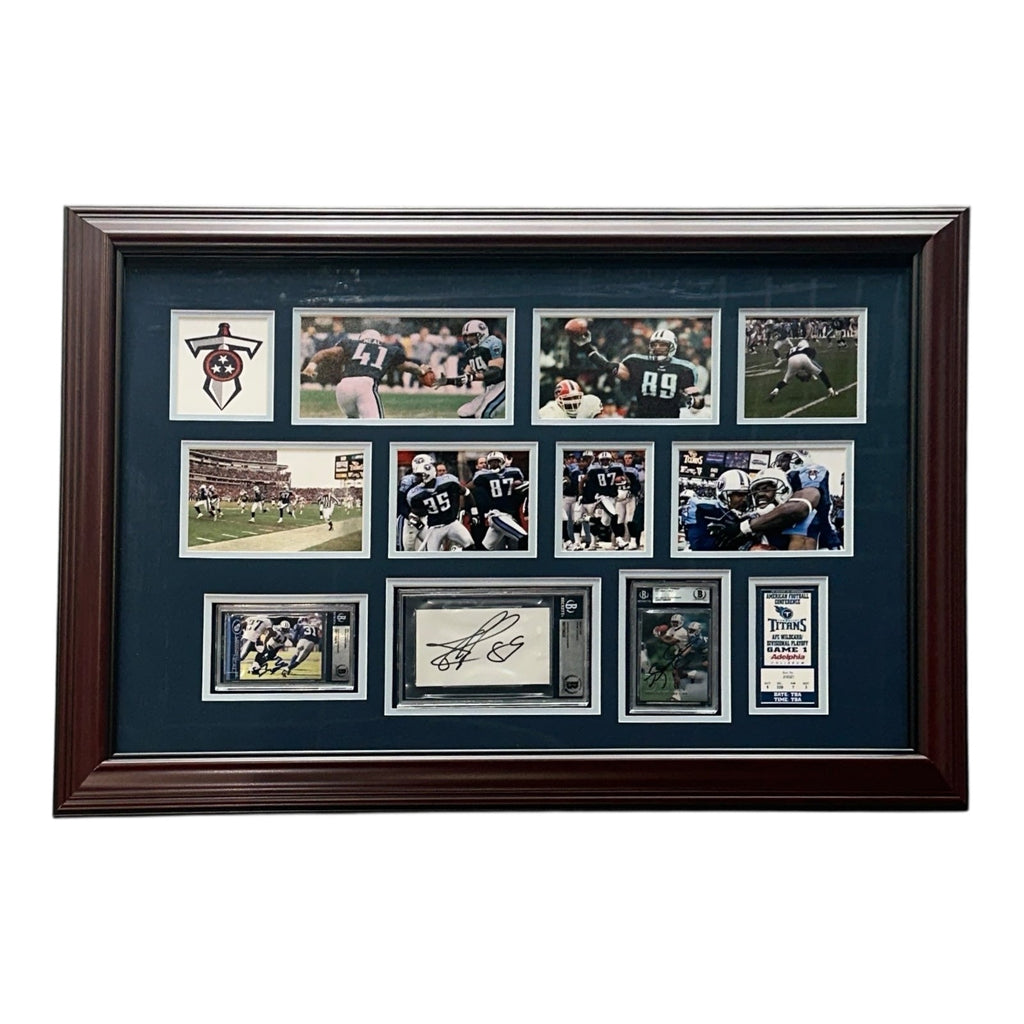 This incredible deluxe framed collage piece features one of the most famous plays in Tennessee Titans football history. The frame features original signatures of Kevin Dyson, Lorenzo Neal, and Frank Wycheck - all authenticated and encapsulated by Beckett. It has been framed and ready to be hang on your wall.
