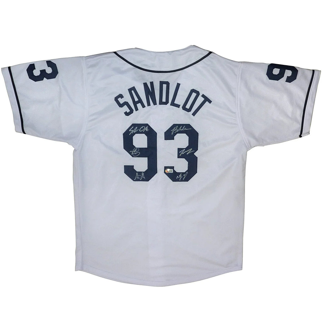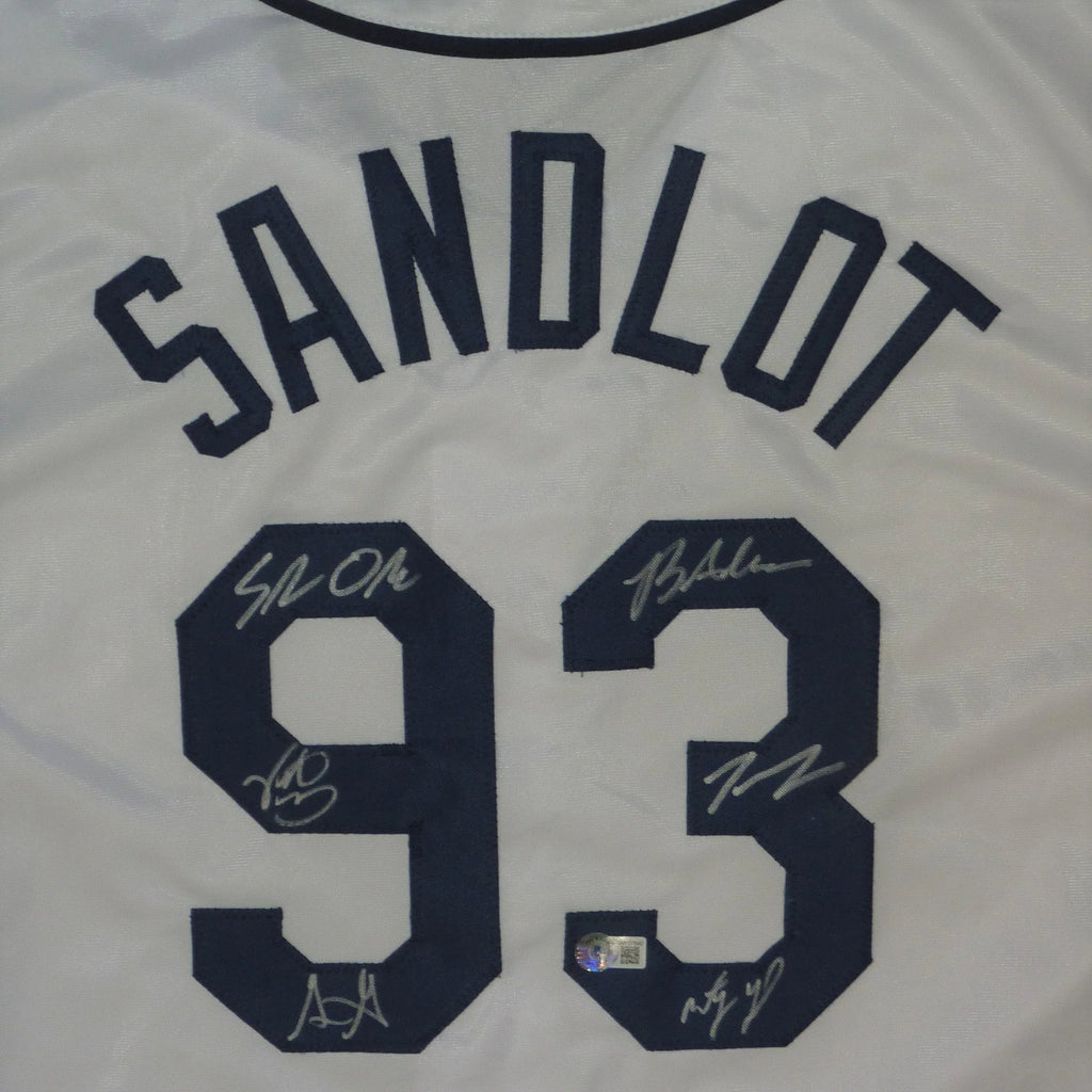 Own a piece of movie history with this autographed Sandlot baseball jersey, signed by six of the iconic cast members. Featuring a white #93 custom design and authenticated by Beckett, this jersey is the ultimate collectible for any fan! Don't miss out on this exclusive and unique item. It is accompanied by a Certificate of Authenticity from Palm Beach Autographs and Beckett. A tamper-evident hologram will be affixed to the item. Each signature is witnessed by a member of our staff or comes out of a private signing.