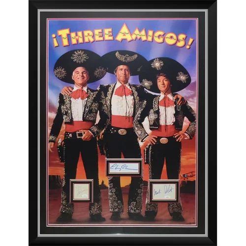 Experience the perfect addition to your movie memorabilia collection with this Three Amigos Full-Size Movie Poster Deluxe Framed! This stunning poster features authentic autographs from the comedic trio of Steve Martin, Chevy Chase, and Martin Short, certified by JSA. Display it in your home and relive the laughs of this classic film. Total frame dimensions are 34x44.