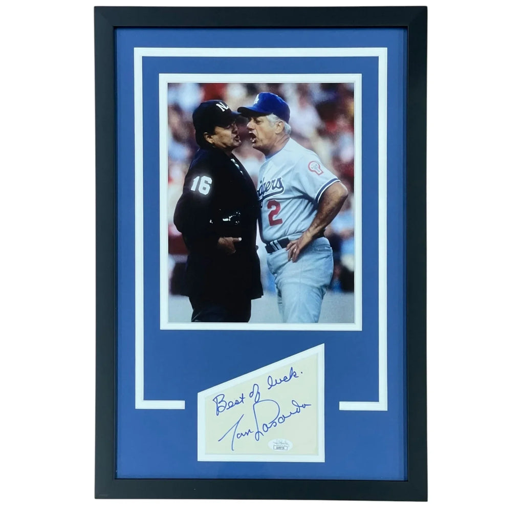Own a piece of history with this Tommy Lasorda Autographed Los Angeles Dodgers Signature Series Frame. This beautifully framed and signed piece is a must-have for any Dodgers fan. Show your passion for the team and admiration for the legendary manager with this JSA authenticated collectible. Bring the spirit of the Dodgers into your home with this rare and coveted Tommy Lasorda autographed frame. Perfect for proudly displaying your fanhood and admiration for the iconic manager.