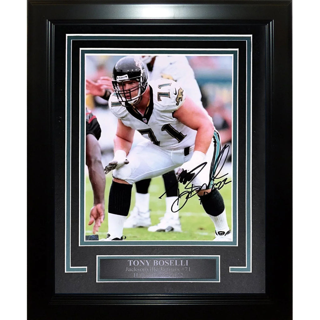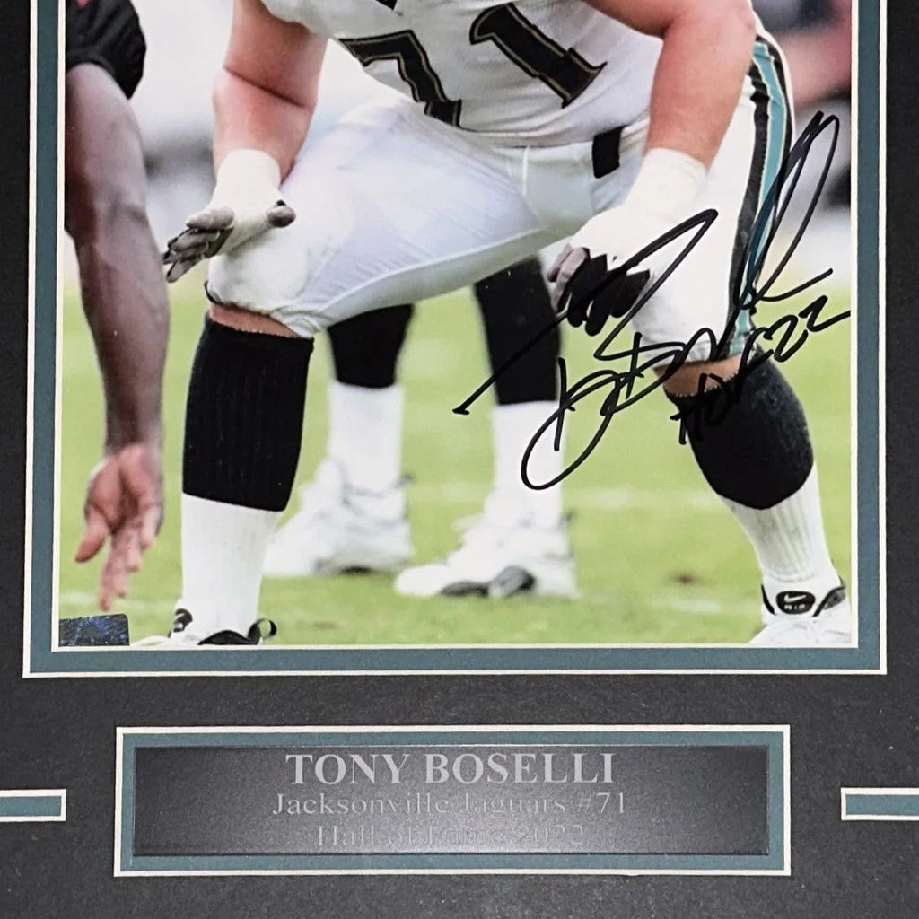 Own a piece of NFL history with this deluxe framed 8x10 photo of legendary player, Tony Boselli. This action shot captures the power and skill of the former Jacksonville Jaguars star. Complete with an autograph and "HOF 22" inscription, this is a must-have for any passionate football fan. Each signature is witnessed by a member of our staff or comes out of a private signing.