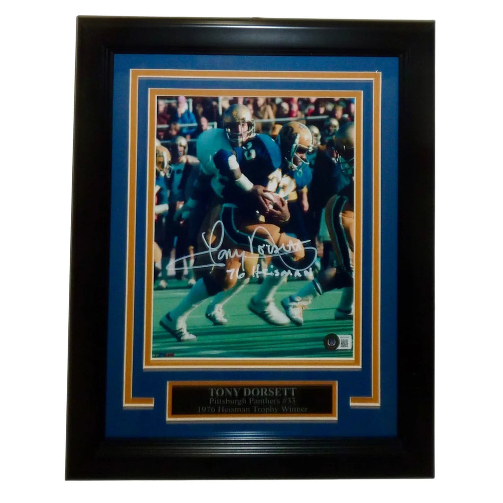 Own a piece of history with this deluxe framed 8x10 photo of Pittsburgh Panthers legend, Tony Dorsett! Not only is this photo personally signed by Dorsett himself, it also includes his iconic "76 Heisman" inscription, certified by Beckett. Display it proudly in your home or office.