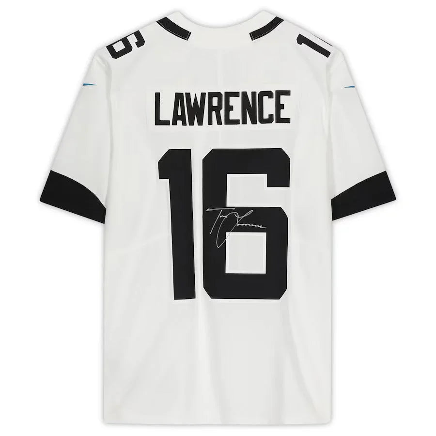 Elevate your game day experience with the Trevor Lawrence Autographed Jacksonville Jaguars Nike Jersey. This white #16 jersey is authenticated by Fanatics, ensuring its authenticity and adding value to any fan collection. Show your support for the team and the talented quarterback with this must-have piece!