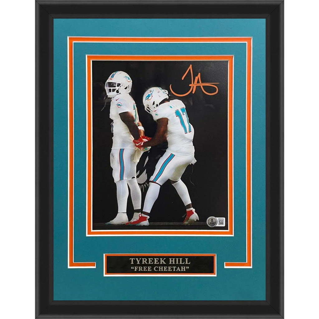 Elevate your fan game with this autographed photo of Tyreek Hill's iconic handcuff celebration. This deluxe 8x10 photo features Hill in a Miami Dolphins jersey being handcuffed and comes authenticated by Beckett. Own a piece of history and showcase your passion for the game and this dynamic player.