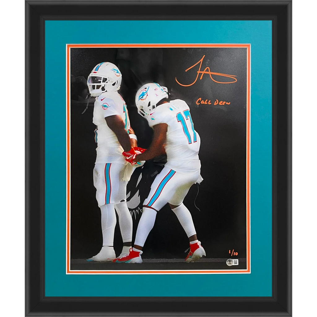 Upgrade your sports memorabilia collection with this limited-edition Tyreek Hill autographed Miami Dolphins photo! The deluxe framed 16x20 photo captures Hill's iconic "Handcuffs Celebration Spotlight" moment, signed by the superstar himself. Complete with "Call Drew" inscription and Beckett authentication, this piece is a must-have for any fan. Only 10 available, act fast!