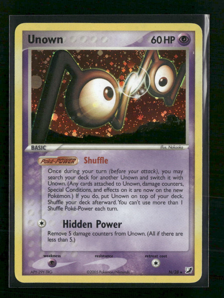 Card Number: N/28 Category: Collectible Trading Cards Condition: Lightly played Player/Character: Unown (N) Set: Unseen Forces Type: Collectible Card Game Year: 2005 Game: POKEMON Rarity: Holo Rare
