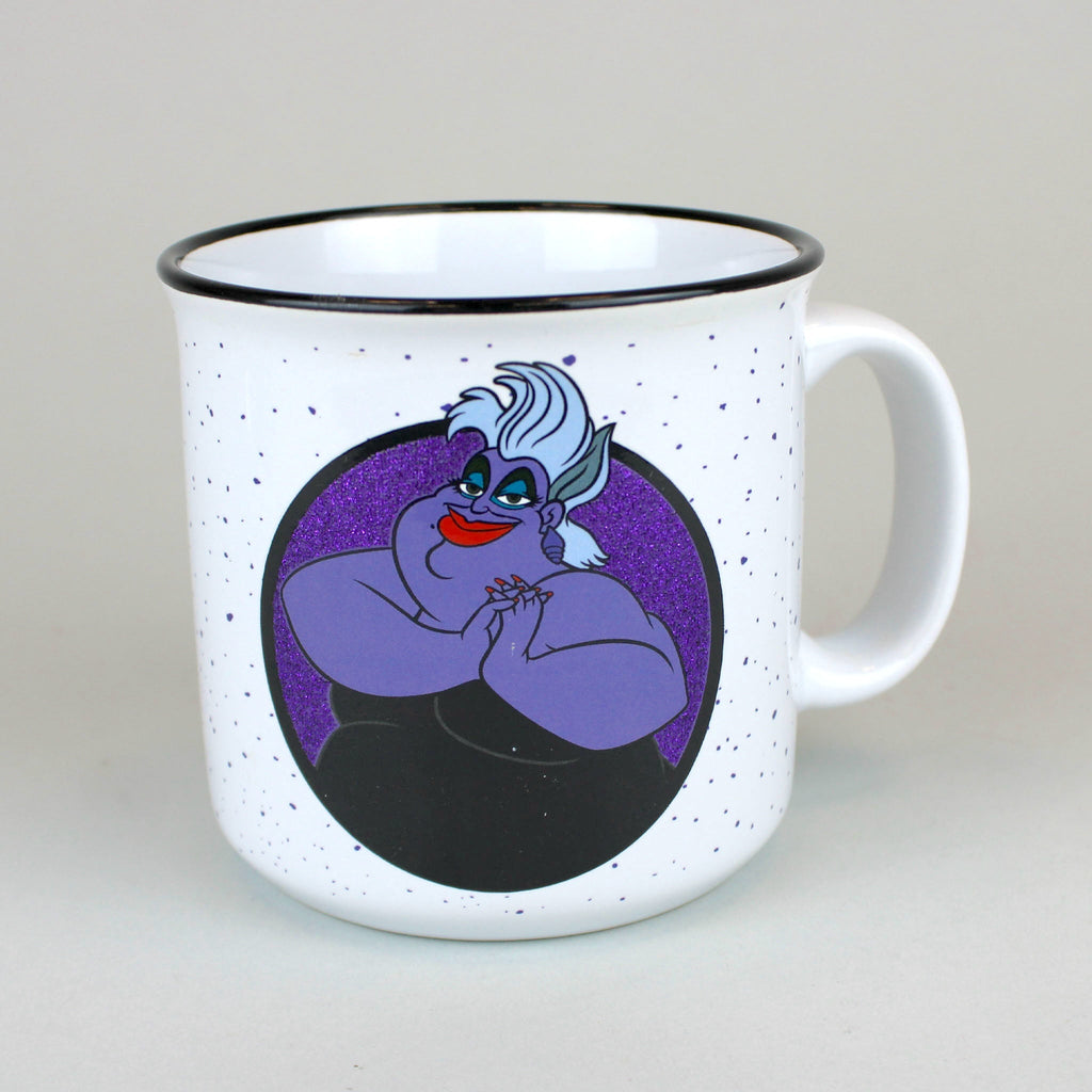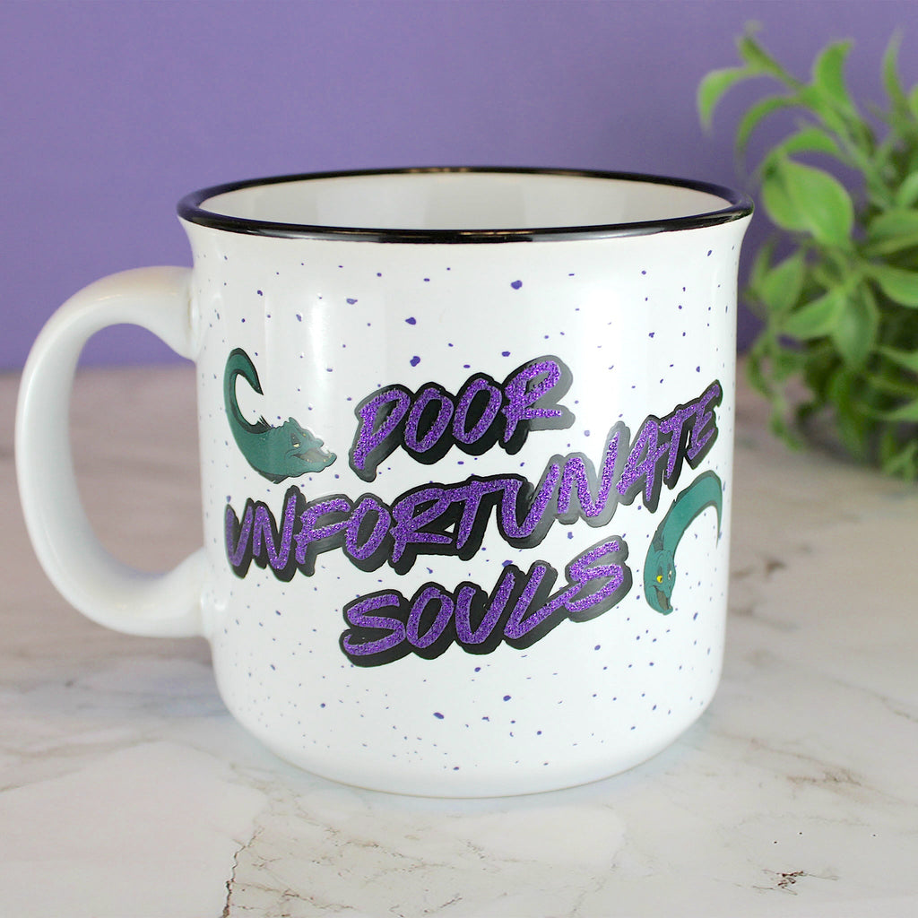 Drink your caffeine like a sea witch with this glittery camper mug featuring Ursula from The Little Mermaid! The front of the mug features Ursula standing innocently in front of a glittery purple background and the reverse features the quote "poor unfortunate souls" with Flotsam and Jetsam surrounding the letters. Enjoy your favorite drink, fill it with your favorite accessories, or gift it!