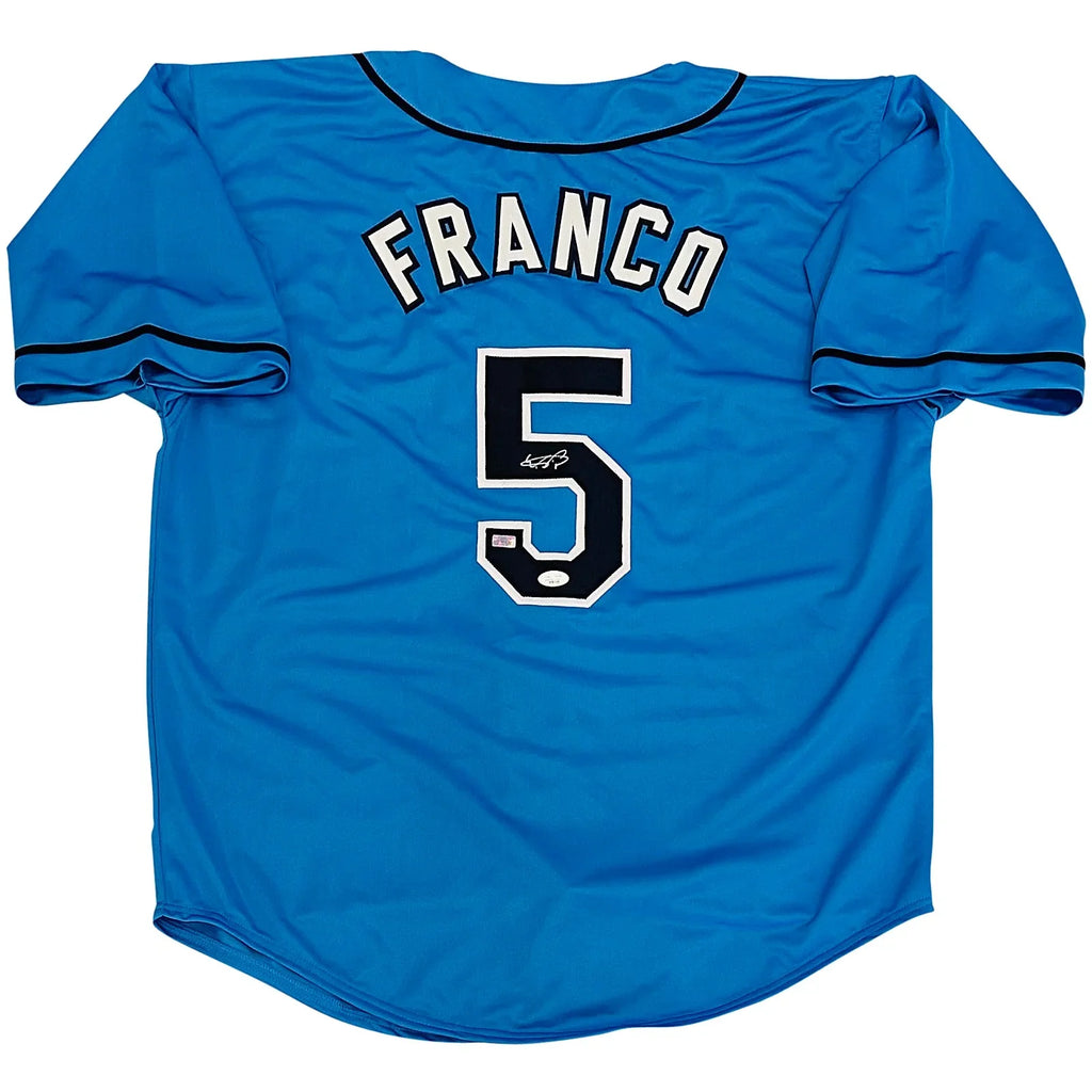 This custom jersey, autographed by Wander Franco, is a must-have for any Tampa Bay fan. The light blue color and #5 make it a unique and standout piece. With a JSA authentication, you can trust the authenticity of this special item. Support your team and your love for baseball with this exclusive piece!