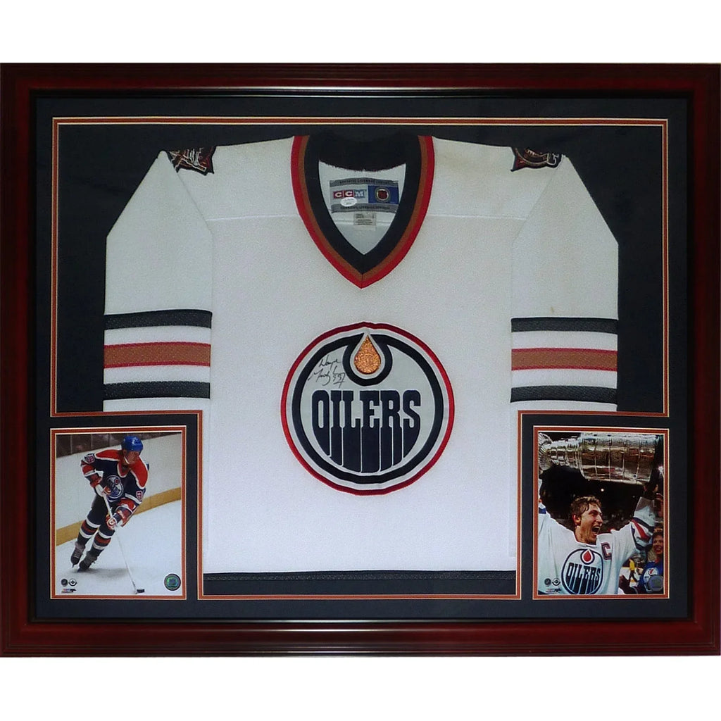 Own a piece of hockey history with this autographed Wayne Gretzky Edmonton Oilers jersey! This deluxe framed jersey comes with a JSA letter of authenticity, ensuring its value and quality. A must-have for any fan or collector, this jersey brings the excitement and passion of the game right into your home. The total frame dimensions measure 44 x 36.