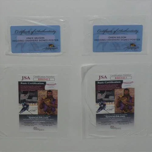 Experience the excitement of Wedding Crashers with this deluxe framed movie poster featuring autographs from stars Owen Wilson and Vince Vaughn! Certified by JSA, this full-size poster is the perfect addition to your collection. Relive the laughter and unforgettable moments over and over again! Total frame dimensions are 34x44.