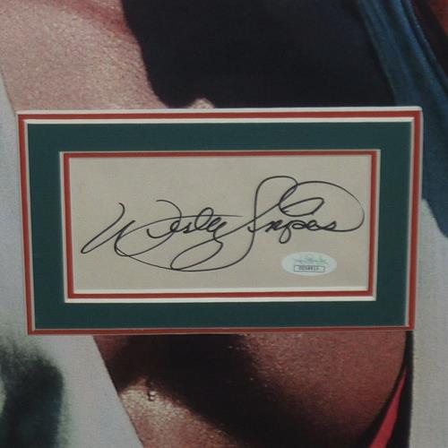 Experience the ultimate tribute to the iconic sports comedy "White Men Can't Jump" with this full-size movie poster, deluxe framed and autographed by stars Wesley Snipes and Woody Harrelson. Certified by JSA, this stunning piece will bring the energy and excitement of the film right into your home! Total frame dimensions are 34 x 44.