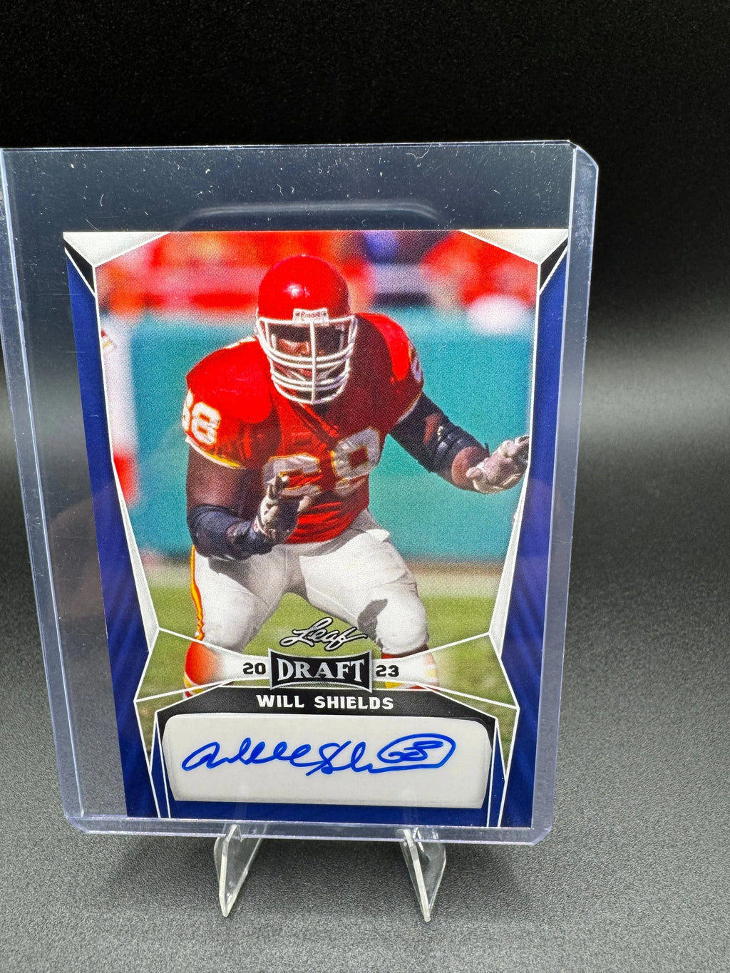 This 2023 Leaf Draft White autograph card features Will Shields, a future Hall of Famer and legendary Kansas City Chiefs guard. Showcasing Shields’ signature, this card is a prized collectible for serious enthusiasts, highlighting the legacy of one of the NFL’s most durable and respected offensive linemen. Ideal for collectors seeking a valuable piece honoring a cornerstone of Chiefs history.