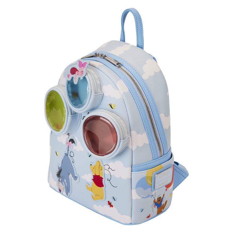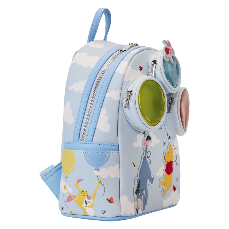 Need a lift? Soar through your day with our Loungefly Disney Winnie the Pooh Balloon Mini Backpack. This triple-pocket backpack features fully figural balloons with zip-around pockets. Each balloon pocket is covered in a clear PVC material, which makes the colors inside shimmer. Printed appliques of Disney’s Eeyore and Winnie the Pooh hold onto the tail ends of their balloons as they soar through the clouds. At the top, Disney’s Piglet rests upon his own balloon pocket. Embroidered butterflies share the sky with these lovable characters as well. The cloud details continue on the top of the backpack, and the side pockets include colorful prints of Disney’s Rabbit and Roo with their balloons. On the back, Disney’s Tigger appears as a print, upside down, his tail grasping three balloons. Pack your daily essentials and prepare to get carried away with this charming accessory.