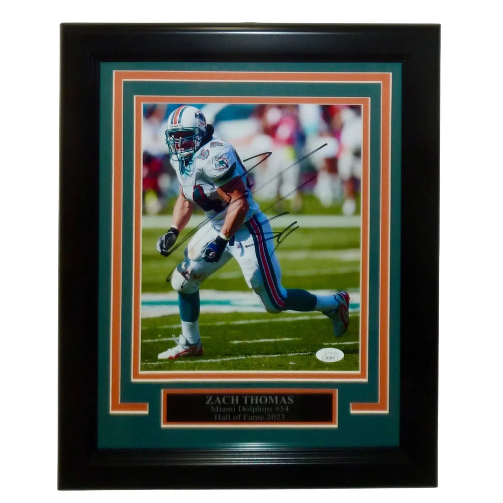 Own a piece of football history with this Zach Thomas autographed Miami Dolphins deluxe framed 8x10 photo verified by JSA. Perfect for any fan or collector, this stunning display showcases Thomas' skill and dedication to the game. Add it to your collection today and show off your love for the Dolphins!